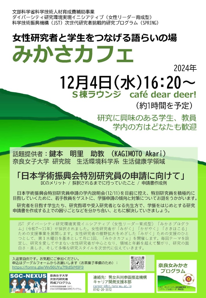 (12/4)女性研究者と学生をつなげる語らいの場<みかさカフェ>ゲスト:鍵本 明里 助教