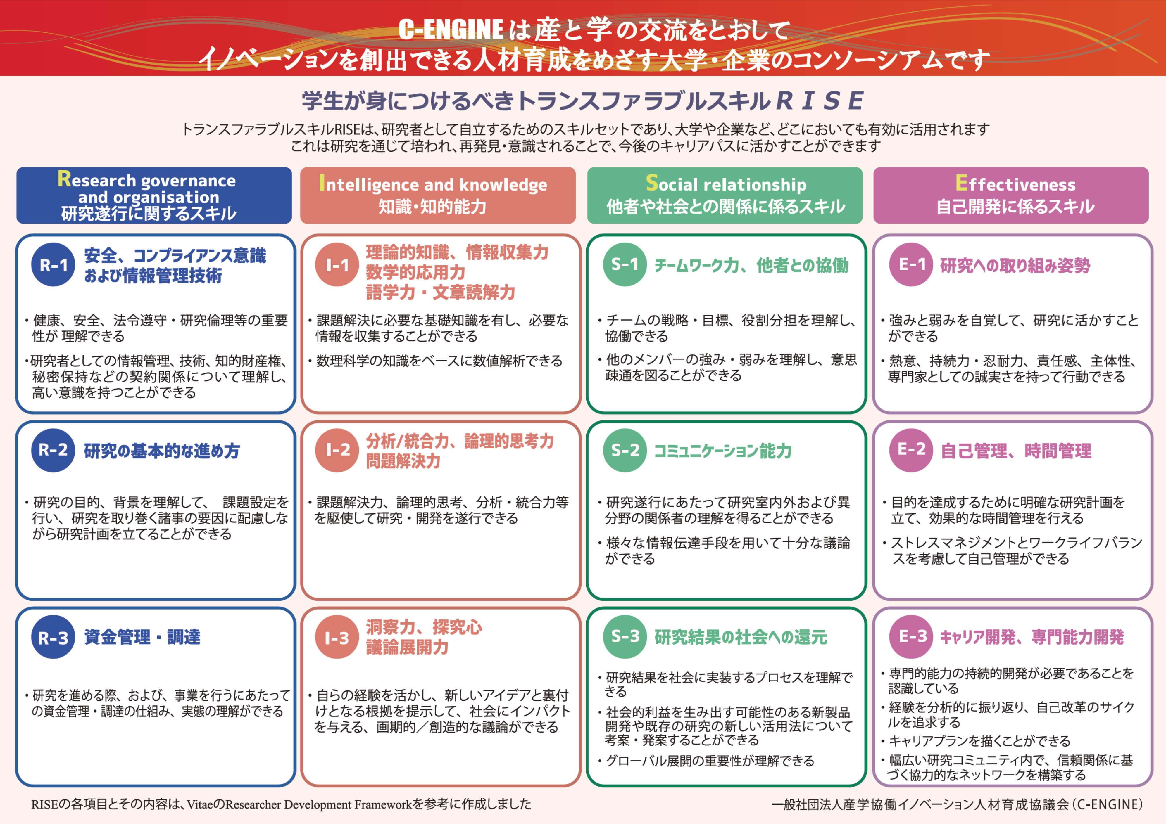 t.s.RISEは研究を通じて身につく、研究者として自立するためのスキルセットです。4×3=12に整理されたスキルの一覧は、産学協働イノベーション人材育成協議会(C-ENGINE)が策定したものです。