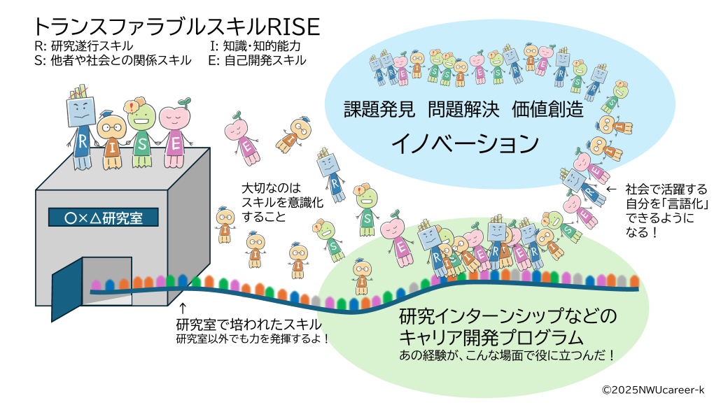 キャリア開発支援本部は、トランスファラブルスキル【RISE】を推し進め、将来の職場や研究室で活躍できる大学院生を応援します。