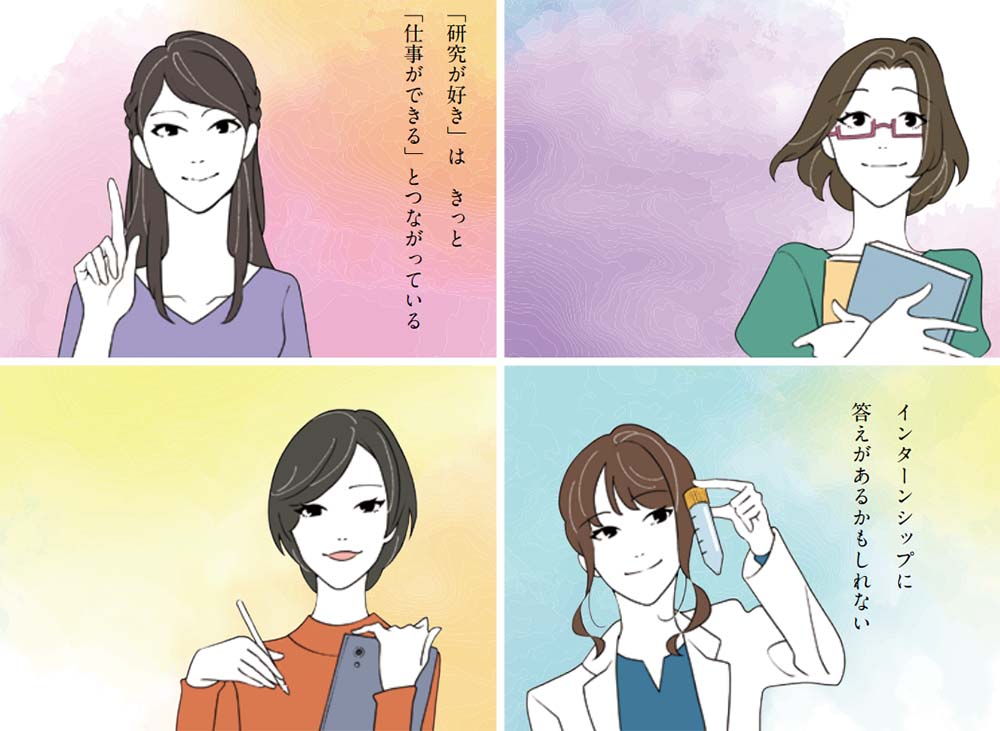 - 理学系の研究では得にくい製品化を視野に入れて研究を進 めるスキルが必要であることを学びました。社員の方々から 仕事のやりがい、困難なことへの対処法など、多くのことを 教えていただけました。
